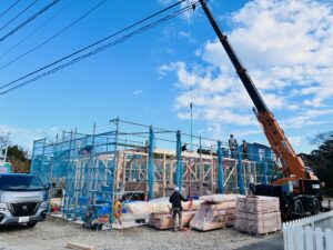 青空の広がる海のそばで、平家住宅の上棟が無事に完了しました。