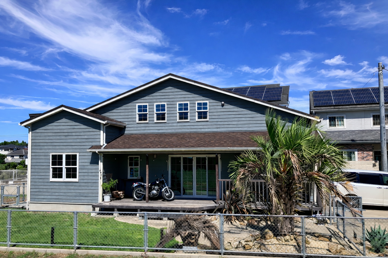 落ち着きのある外観にホワイトサッシを合わせ、爽やかさとカッコよさを両立させました。